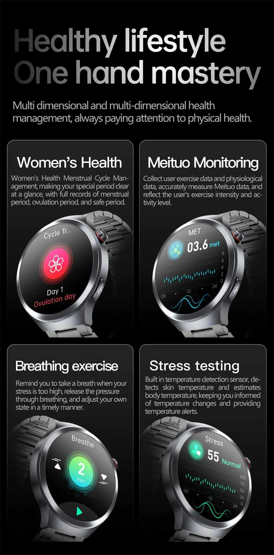 Metrics measured: Heart Rate Monitor,Other,Blood Oxygen Monitor,Sleep Monitor,Blood Pressure Monitor,Body Temperature Monitor,Stress Monitor