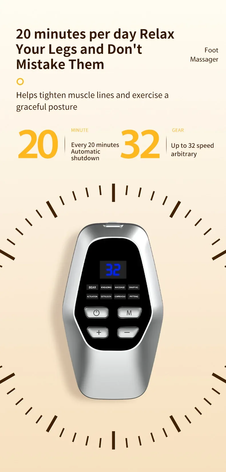 4.20-minute automatic timer, no need to time it by yourself to avoid excessive massage; use it for 20 minutes every day to help you say goodbye to fat legs.