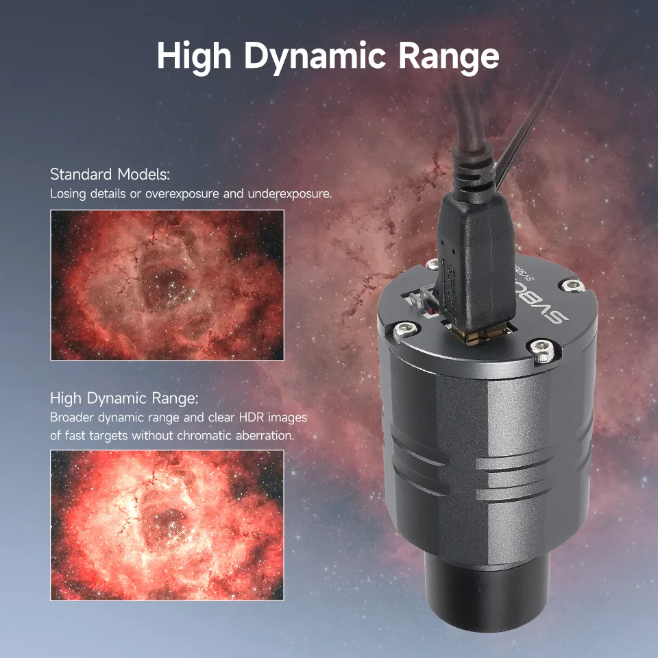 The planetary camera with High Dynamic Range (HDR) captures fast-moving targets with clear, vibrant images, offering a broader dynamic range and no chromatic aberration for precise planetary details