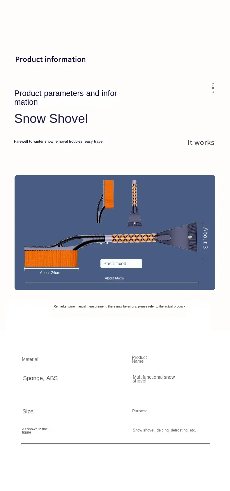 ●Snow removal brush head: ABS high-strength plastic, PVC brush filament resistant to low temperatures and not easy to break